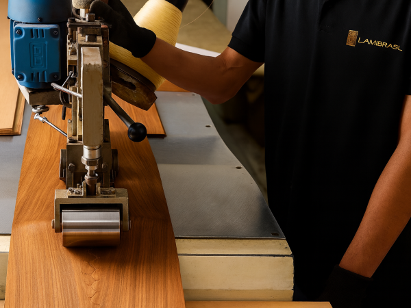 Na LamiBrasil, o processo de junção é feito com uma máquina industrial específica de alta precisão, garantindo uma emenda perfeita e um resultado profissional. O processo envolve seleção das lâminas, considerando tonalidade e direção do veio da folha; alinhamento milimétrico, garantindo que os veios da madeira fiquem “casados” visualmente; emenda com colagem precisa; inspeção de qualidade, para garantir que a emenda esteja fechada, uniforme e duradoura.